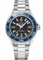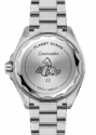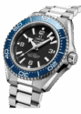 Dieses 42 mm Modell ist mit einem Gehäuse aus poliertem und gebürstetem Edelstahl gefertigt. Die Uhr verfügt über einen Lünettenring aus polierter blauer Keramik mit einer Taucherskala aus weißer Emaille, der innere Ring besteht aus poliertem Titan Grad 5.