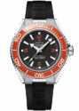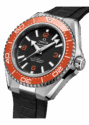 Dieses 42 mm Modell ist mit einem Gehäuse aus poliertem und gebürstetem Edelstahl gefertigt. Die Uhr verfügt über einen Lünettenring aus polierter orangefarbener Keramik mit einer Taucherskala aus weißer Hybrid-Keramik, der innere Ring besteht aus poliertem Titan Grad 5.