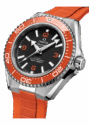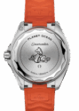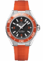 Dieses 42 mm Modell ist mit einem Gehäuse aus poliertem und gebürstetem Edelstahl gefertigt. Die Uhr verfügt über einen Lünettenring aus polierter orangefarbener Keramik mit einer Taucherskala aus weißer Hybrid-Keramik, der innere Ring besteht aus poliertem Titan Grad 5.