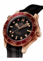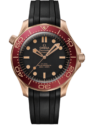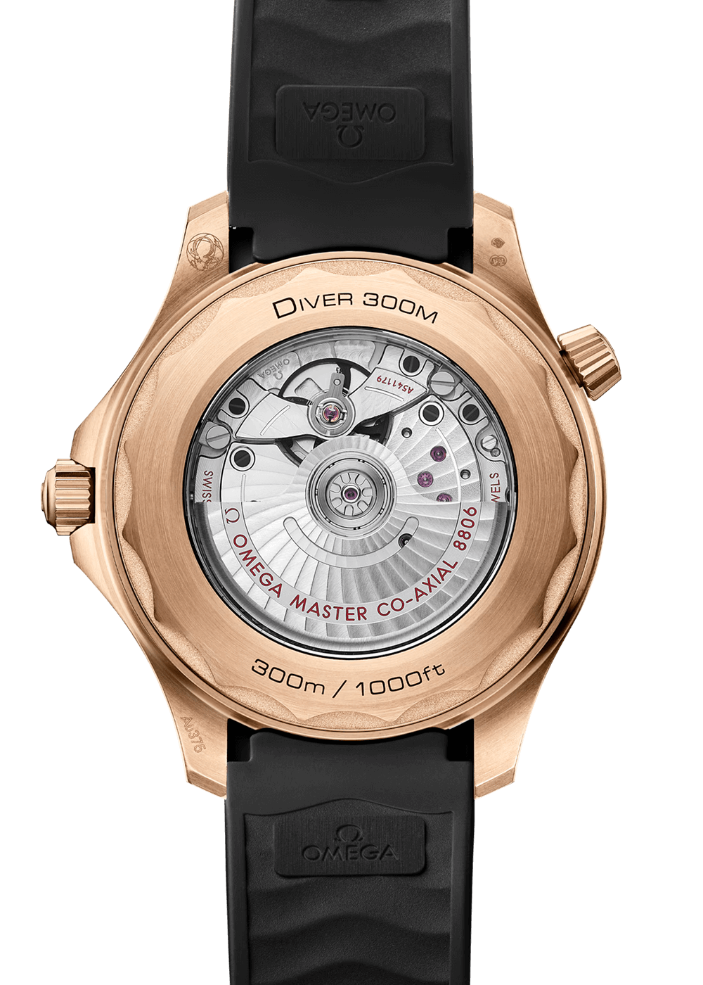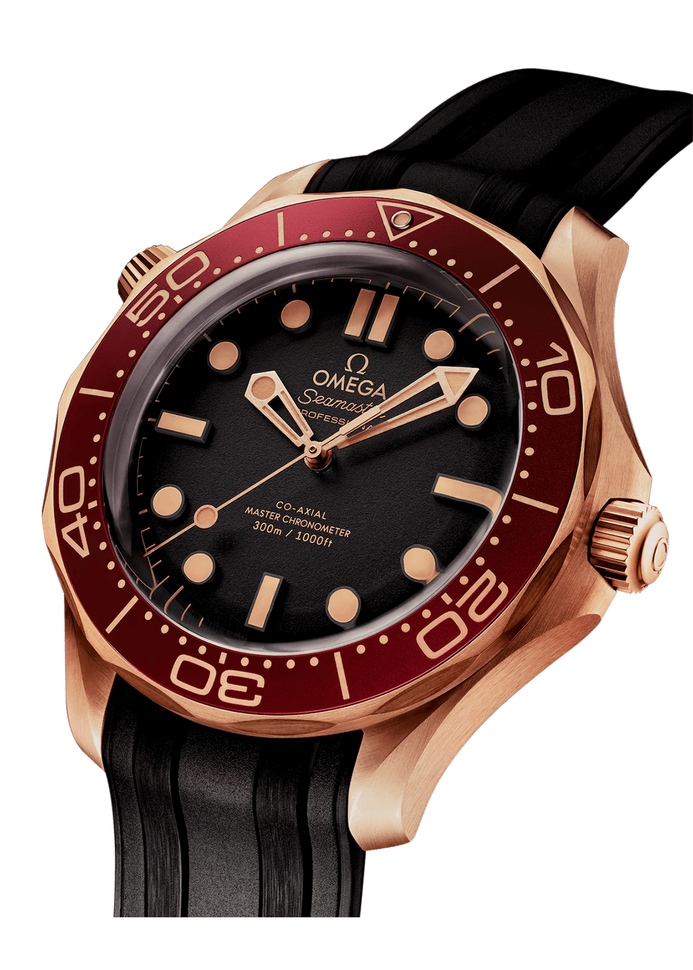 Das 42-mm-Gehäuse aus OMEGAs exklusivem Bronze-Gold verfügt über einen burgunderroten, mit Oxalsäure eloxierten Lünettenring aus Aluminium, der eine Tauchskala aus Vintage-Super-LumiNova aufweist.