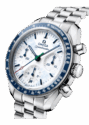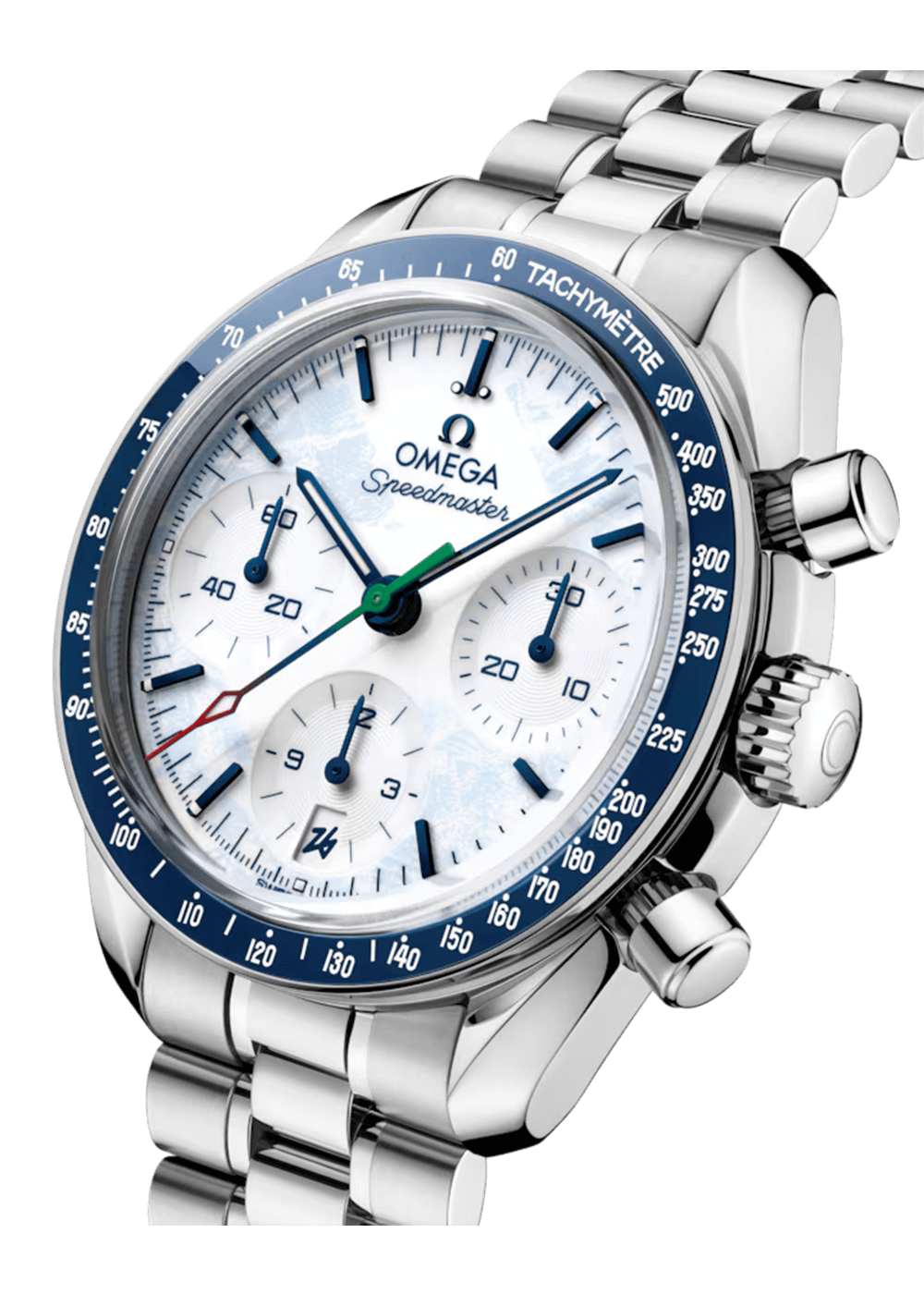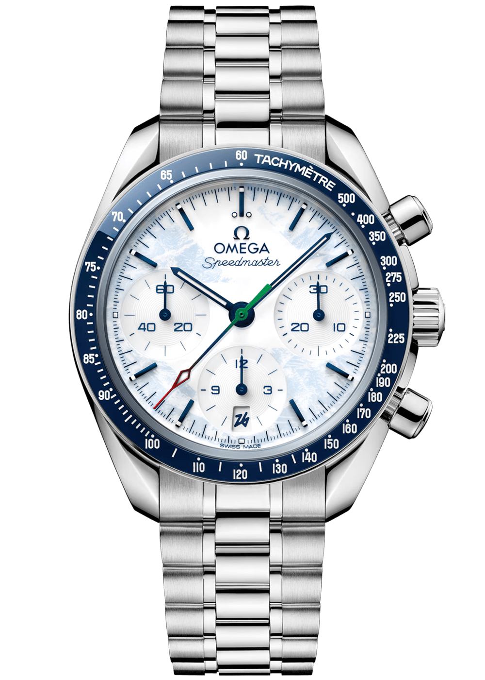 Die 38 mm große Uhr ist aus Edelstahl gefertigt und verfügt über eine blaue Keramiklünette mit einer Tachymeterskala aus weißer Emaille. Für einen winterlichen Look ist das lackierte weiße Zifferblatt mit einem mattierten blauen Aufsatz und einem Fingerabdruckmuster versehen, inspiriert vom Emblem der Milano Cortina 2026.