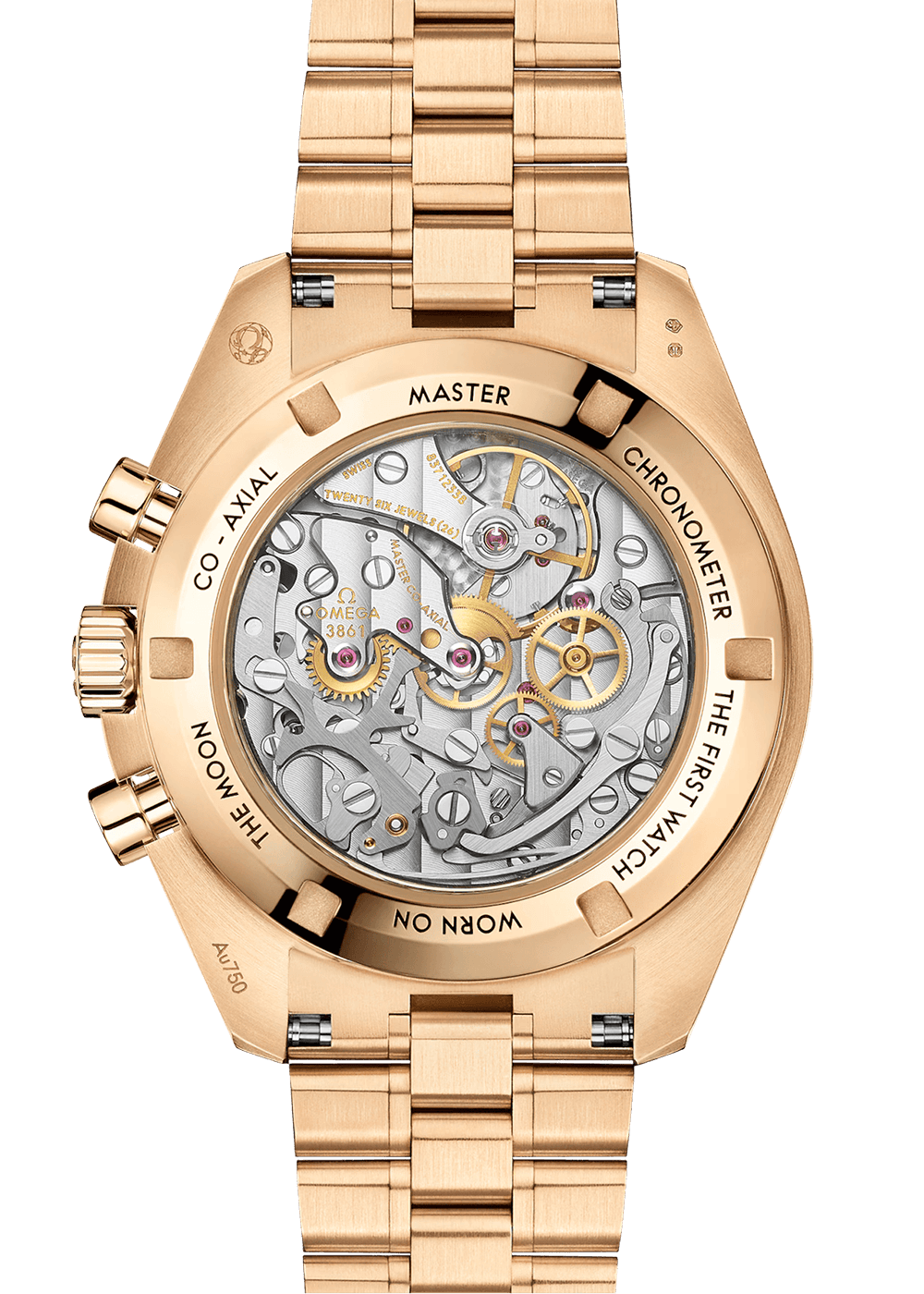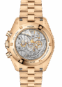 Die von der 4. Generation inspirierte Monduhr mit Gehäuse und Armband aus 18 Karat Moonshine-Gold hat ein grünes „abgestuftes“ PVD-Zifferblatt und Zeiger im „Moonwatch“-Stil. Der grüne Keramik-Lünettenring mit OMEGA Ceragold™-Tachymeterskala ist mit dem berühmten „Punkt über der 90“ versehen.