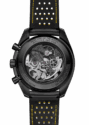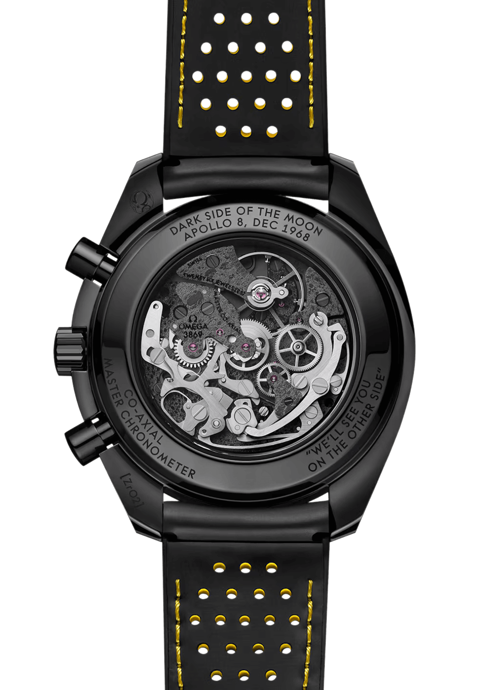Durch das skelettierte Zifferblatt ist das Co-Axial Master Chronometer Kaliber 3869 von OMEGA zu sehen. Dieses Uhrwerk entspricht nicht nur den höchsten Präzisionsstandards der Industrie, sondern zeigt auch eine per Laser bearbeitete Darstellung der Mondoberfläche auf der geschwärzten Hauptplatine und den Brücken. Dank der Lasergravur und den kontrastierenden Oberflächen ist die Auflösung höher als je zuvor. aAlle Mitglieder der Crew von Apollo 8 trugen während ihrer Mission eine OMEGA Speedmaster am Handgelenk.