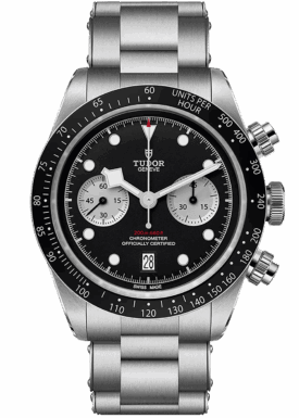 Vertiefte, champagnerfarbene Totalisatoren sorgen für optimalen Kontrast. In der Tradition der TUDOR Chronographen befindet sich eine Datumsanzeige auf der 6-Uhr-Position. Mit einem schmalen 41-mm-Gehäuse in Edelstahl und Drückern in Gelbgold, die von der allerersten Generation der TUDOR Chronographen inspiriert sind, behält dieses Modell die Hauptmerkmale der Black Bay Linie bei. Eine feststehende Lünette in Gelbgold mit Zahlenscheibe aus schwarz eloxiertem Aluminium und Tachymeterskala rundet diesen eleganten und sportlichen Chronographen ab.